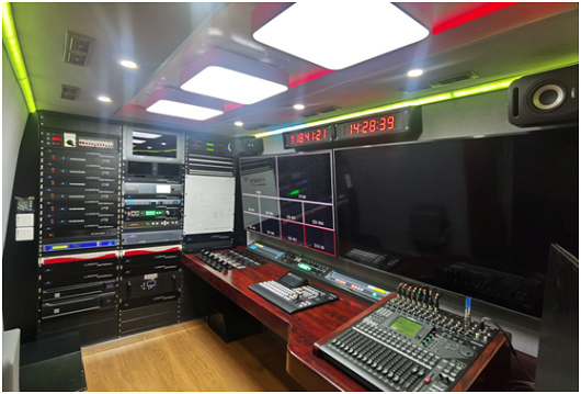 此車輛采用依維柯底盤,車長6.99米。車內(nèi)采用L型布局,內(nèi)飾空間布局方便合理。改裝后車內(nèi)高度可達(dá)1.8米,車內(nèi)采用4工位式設(shè)計(jì),支持6路光纖訊道攝像機(jī)和2路無線圖傳攝像機(jī)同時(shí)攝錄。設(shè)置的有拓展空間。